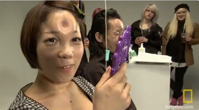 Funciona assim: o adepto da moda recebe injeção de uma solução com sais na testa, até que apareça a forma de uma rosquinha - daquelas que o Homer Simpson adora.