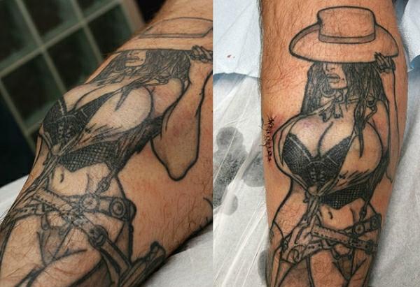 Para dar mais vida a sua tatuagem um homem resolveu implantar silicone nos seios de uma mulher tatuada em sua perna.