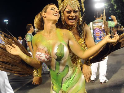 | Denise Rocha, conhecida como Furacão da CPI, fez sua estreia na Sapucaí com o corpo pintado. (Foto: Daniel Ramalho / Terra) |