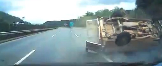 As imagens captadas por uma câmera instalada em um veículo, mostram o momento em que o motorista tente efetuar uma ultrapassagem, perde o controle e capota. Vários pedaços do carro ficam espalhados pela rodovia, mas o motorista sai andando, aparentemente sem ferimentos.